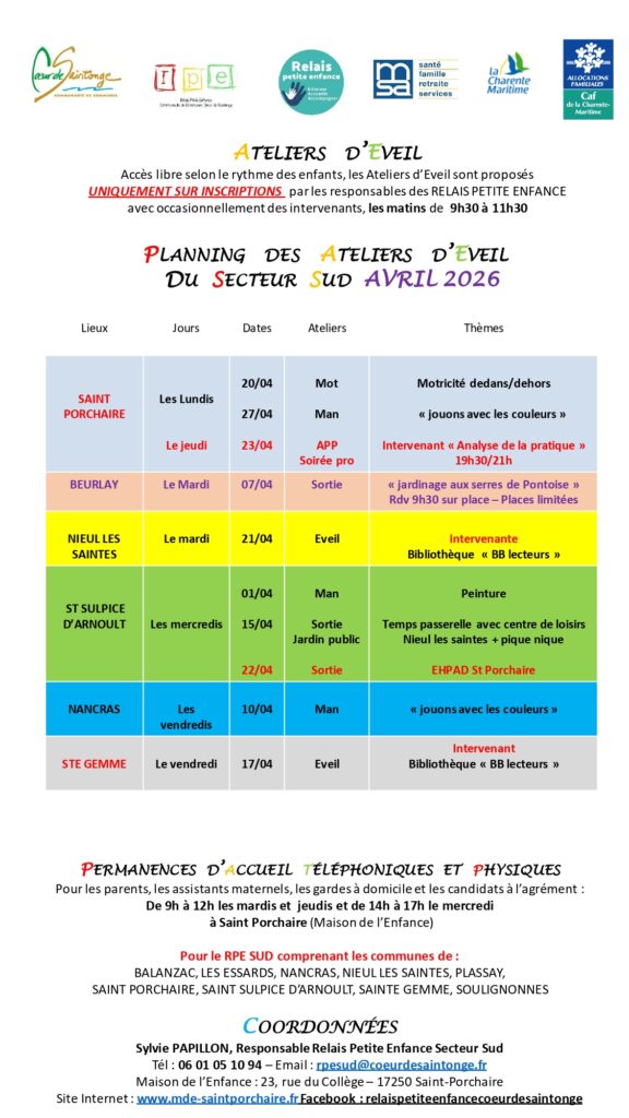 Des ateliers d’éveils supplémentaires sont également organisés ponctuellement (1 fois par mois ou trimestre) sur d’autres communes du territoire (Nieul lès Saintes, Soulignonnes, Trizay, Pont l’Abbé d’Arnoult, Sainte Gemme et Beurlay).