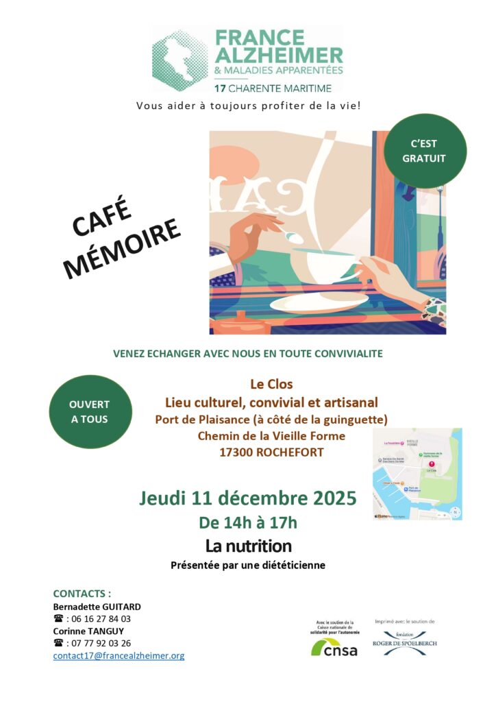 L’association France Alzheimer Charente Maritime organise son deuxième café mémoire, le jeudi 11 décembre 2025 à 14h à Le Clos (Lieu culturel, convivial et artisanal) Chemin de la Vieille Forme 17300 ROCHEFORT.