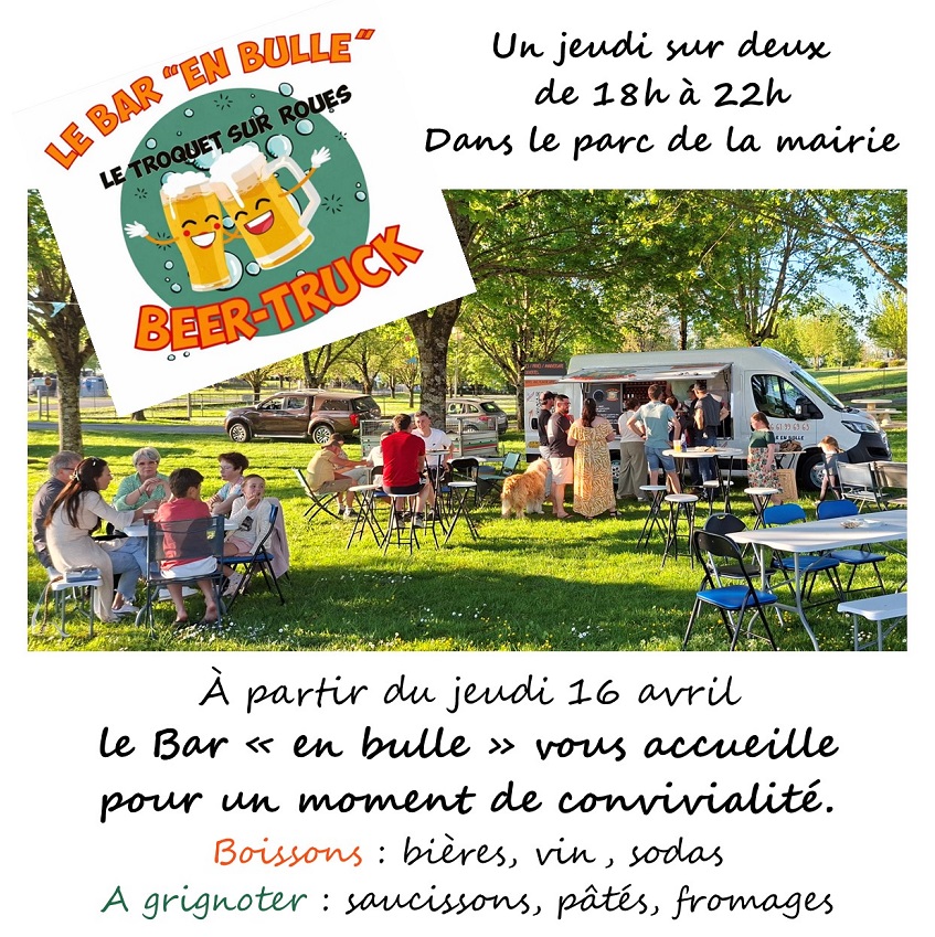Après un faux départ le 2 avril en raison de la météo, le Bar en Bulle vous accueille ce jeudi soir dans le parc de la mairie pour un moment convivial à partir de 18h :