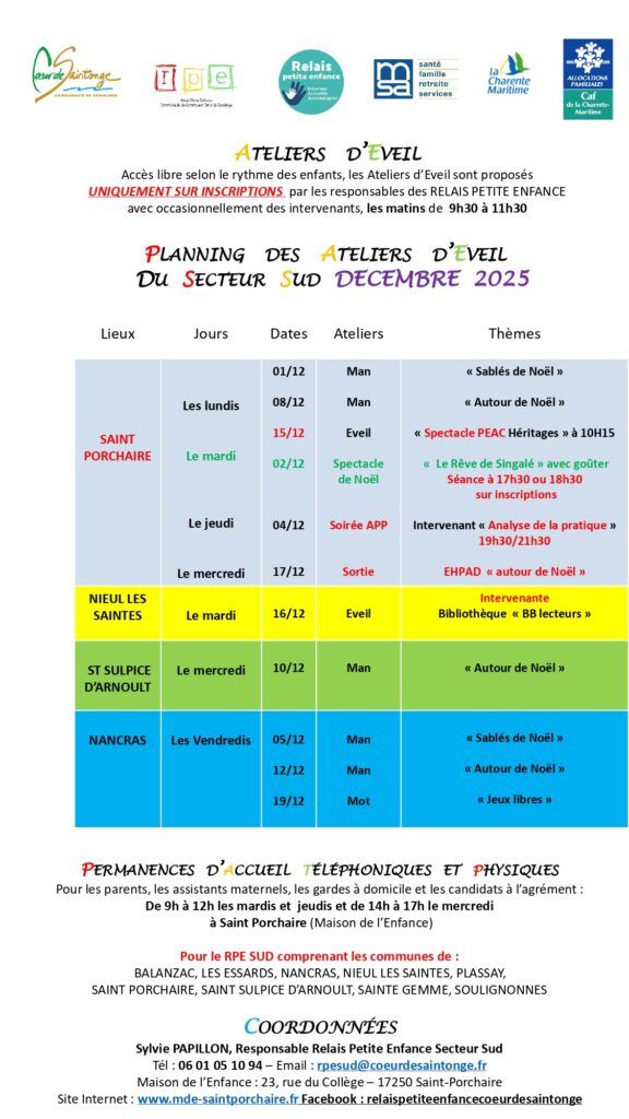 Des ateliers d’éveils supplémentaires sont également organisés ponctuellement (1 fois par mois ou trimestre) sur d’autres communes du territoire (Nieul lès Saintes, Soulignonnes, Trizay, Pont l’Abbé d’Arnoult, Sainte Gemme et Beurlay).