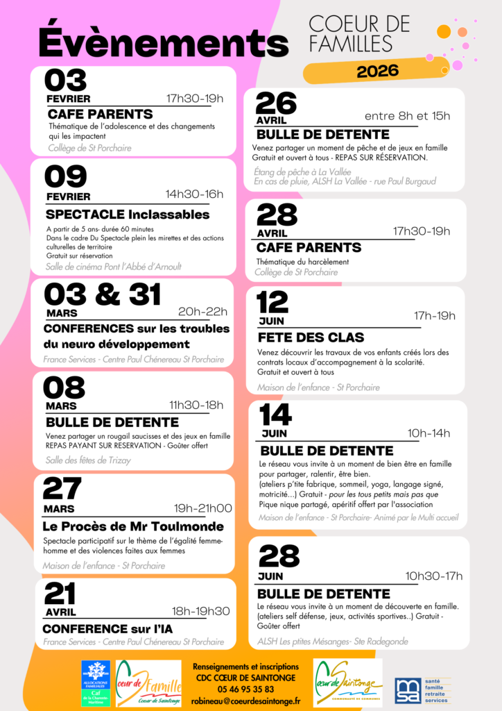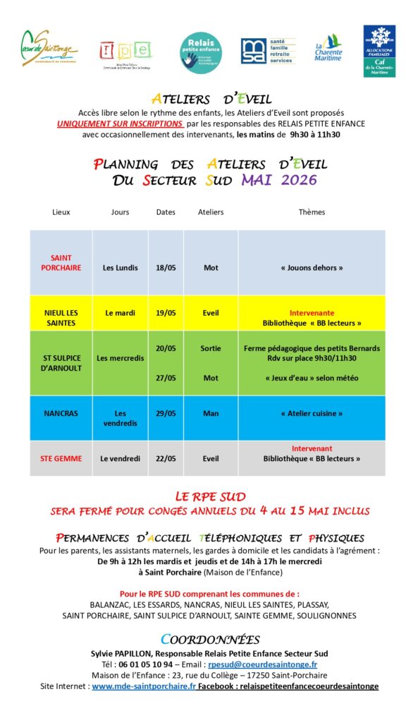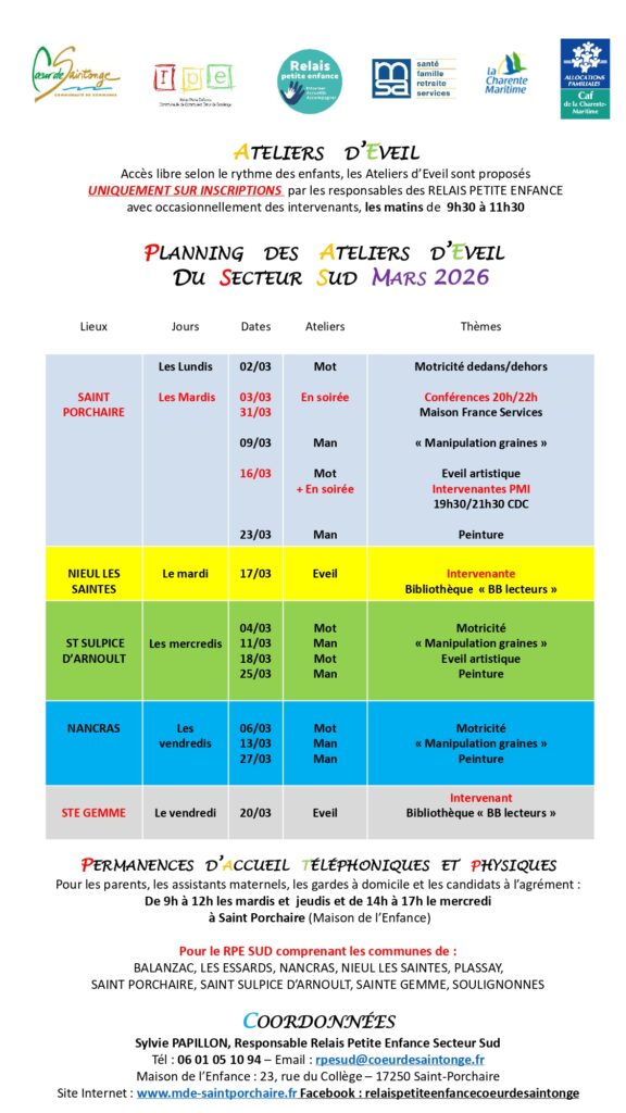 Des ateliers d’éveils supplémentaires sont également organisés ponctuellement (1 fois par mois ou trimestre) sur d’autres communes du territoire (Nieul lès Saintes, Soulignonnes, Trizay, Pont l’Abbé d’Arnoult, Sainte Gemme et Beurlay).