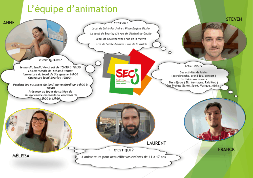 Le sec’J est un espace dédié aux jeunes dès la 6ème et jusqu’à 17 ans, il est composé de 4 locaux : à Ste Gemme, à St Porchaire, à Beurlay et à Soulignonnes.